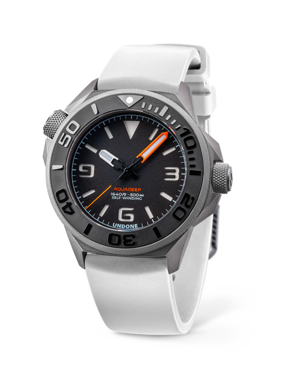 UNDONE takes the best of high-spec engineering and presents the Aquadeep: a diver’s watch that exceeds standards and expectations. With its robust automatic movement, the Aquadeep keeps precise time beneath the waves. Encased in lightweight, yet durable titanium, it’s designed to endure the deepest dives without weighing you down. The high-precision helium escape valve ensures functionality at profound depths, safeguarding against pressure-related complications up to 500 meters underwater.